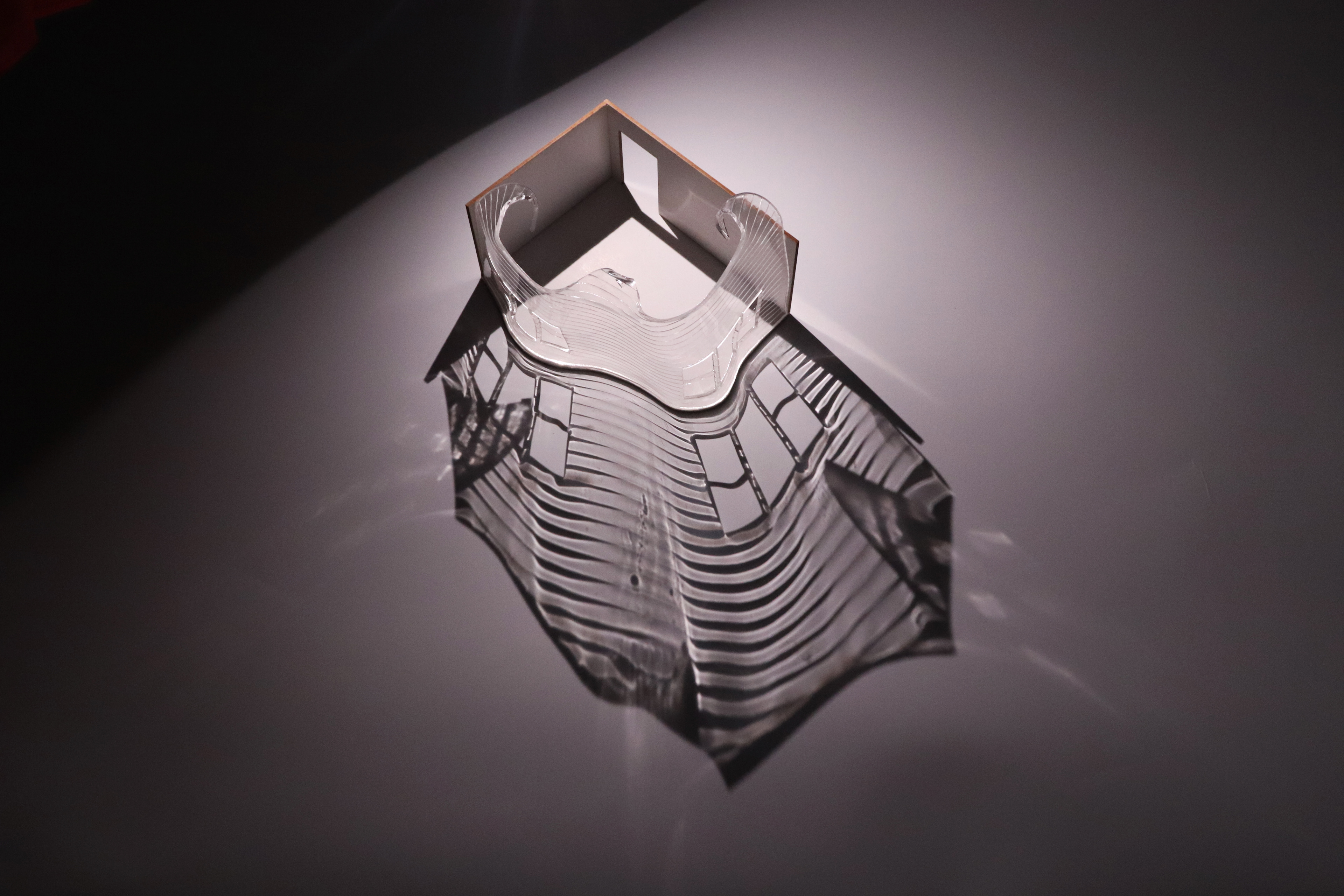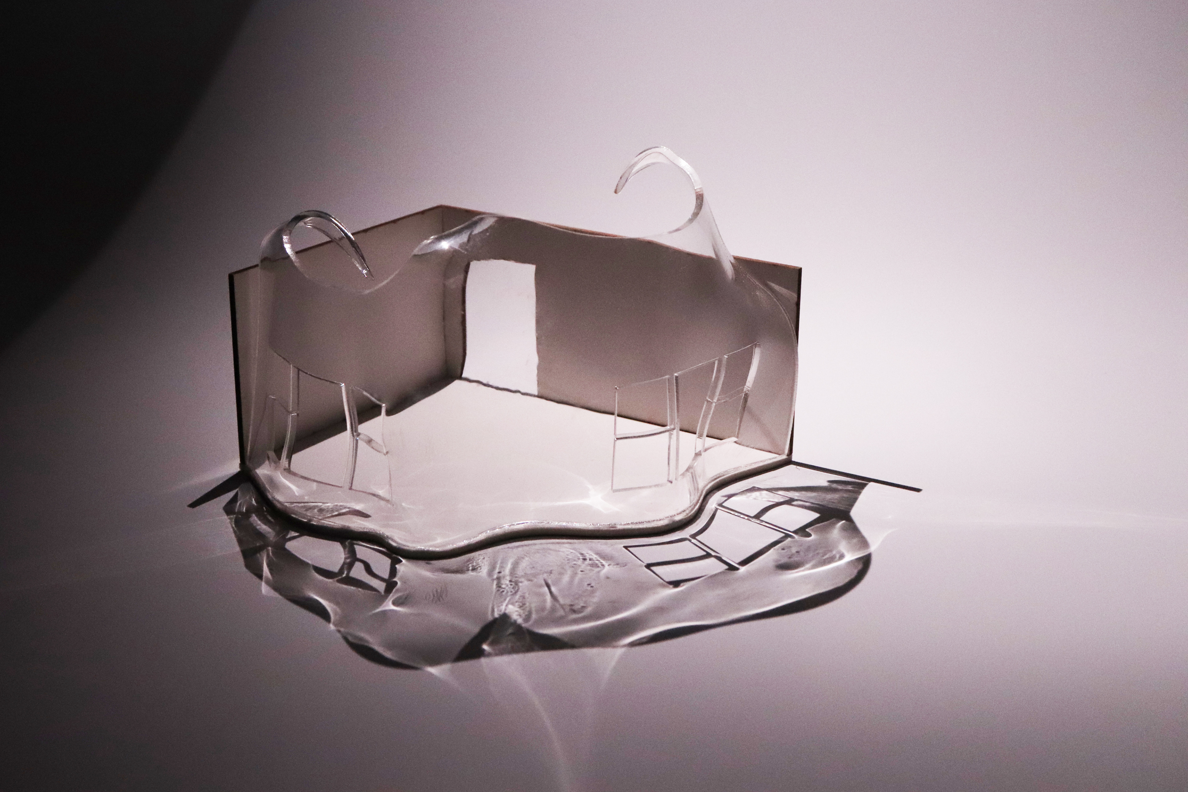 My concept was to expand and explode the walls of my room like a balloon. Due to the nature of that design being very organic, I modelled it using clear acrylic and using heat to manipulate it. Further etching was added to play with light.